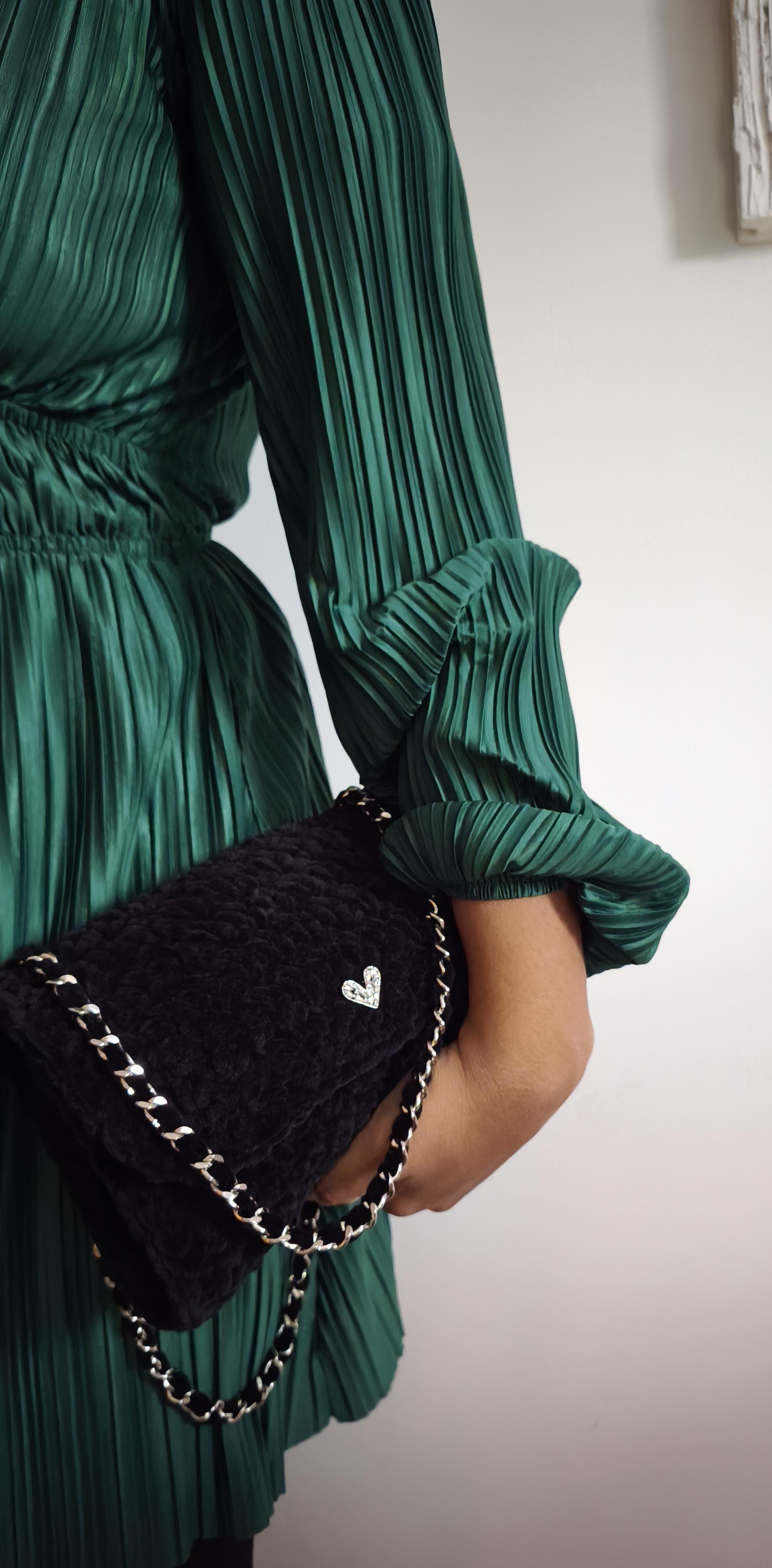 Une chaîne de 120cm en maille de haute qualité, s'adaptera à être portée à l'épaule ou en bandoulière, une pression aimantée permet la fermeture pratique du sac.